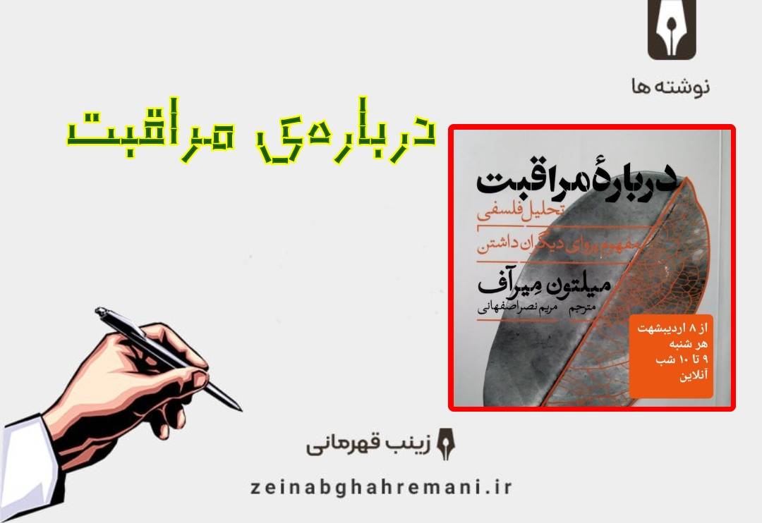 با این زمینه از مراقبت، پیشنهاد سحرجان و دوستان برایِ مطالعهی کتابِ دربارهی مراقبت در دورهمی کتابخوانی در جانم نشست. این کتاب را میلتون میرآف نوشته، مریم نصر اصفهانی آن را ترجمه و نشرِ همان آن را منتشر کرده است. در این کتاب میرآف در قالب شش بخش و 30 گفتار به تحلیل فلسفی مفهوم مراقبت پرداخته است. او مراقبت را یک فرایند میداند که فرد به دیگریِ مناسبِ خود کمک میکند تا به رشد و تحقق مناسبِ خود برسد. این فیلسوف آگاهی، ضرباهنگهای متناوب، بردباری، صداقت، اعتماد، فروتنی، امید و شجاعت را از عناصر اصلی مراقبت میشمارد. خودشکوفایی با مراقبت، اولویت فرایند، توانمندی مراقبت کردن و شایستگی مراقبت شدن، پایدار ماندن دیگری، گناه در مراقبت، رابطهی متقابل و درجات مراقبت در چارچوب مرزها، برخی از جنبههای با ارزش مراقبت در کتابِ دربارهی مراقبت است. او به جنبههای خاص مراقبت چون مراقبت از انسانهای دیگر و مراقبت از خودم توجه دارد. او معتقد است مراقبت میتواند به زندگی نظم دهد و زندگیای با قطعیت بنیادی، کافی بودن جریان آن، دارای وضوح و ایهام، برخوردار از خودآیینی، ایمان و قدرشناسی بیافریند.